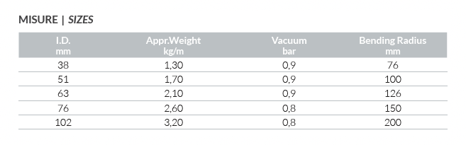 External Cover: Red synthetic rubber; abrasion, ozone and aging resistant, corrugated with yellow PVC helix on the outer surface