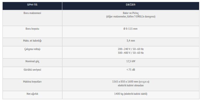 T-DRILL’in yeni tamamen otomatik servo kontrollü Boru Ağzı Sıvama Makinesi SPM-115, bakır ve pirinç tüplerin düz kapatılmaları için tasarlanmıştır. Makinenin hızlı bir döngü süresi vardır, tipik proses süresi borunun teknik özelliklerine bağlı olarak sadece ~ 20–45 saniyedir.