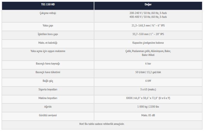 TEC-150 SCH40 kapasite tablosu sadece takım mukavemeti içindir. Tablo aşağıda verilenler için bir gösterge değildir:
