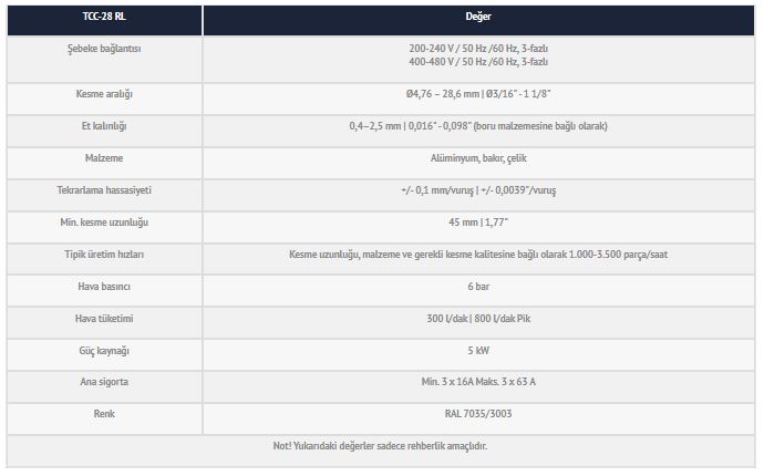 TCC-28 pek çok seçeneğe sahip otomatik bir boru kesme istasyonudur. Düzgün uzunluktaki borular için kesme yarıçapı aralığı 4,76–28 mm’dir (0,185” – 1,1”). Sistem entegre bir toplu üretim yönetim sistemi ile kesme uzunluğunu tam otomatik olarak değiştirme özelliğine sahiptir.